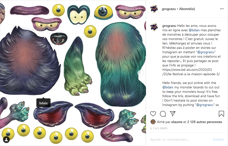 Dans le même genre d’initiatives, il y a le compte @collectivecoloring sur instagram qui propose un pdf avec une trentaine coloriages créés par des artistes. Il me semble qu’ils vont en faire d’autres. Vous pouvez retrouver le pdf sur le site collectivecoloring.com ! Je connais ce projet grâce à Chane (je suis fan de son travail) qui y a participé ! 😁
